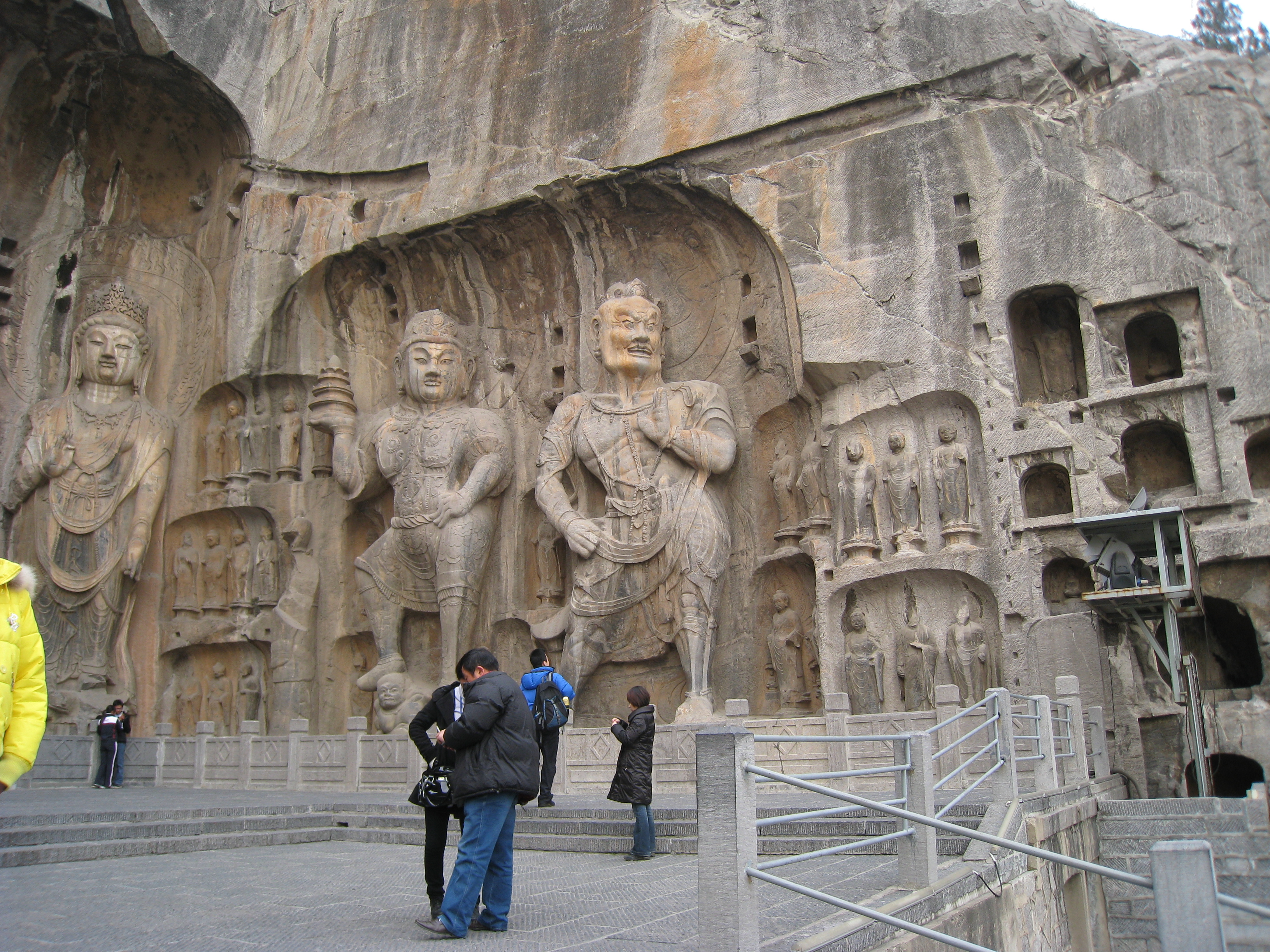 中国河南省竜門石窟奉先寺(唐時代前期) 大像の右から2像目、宝塔を持つ像が多聞天。