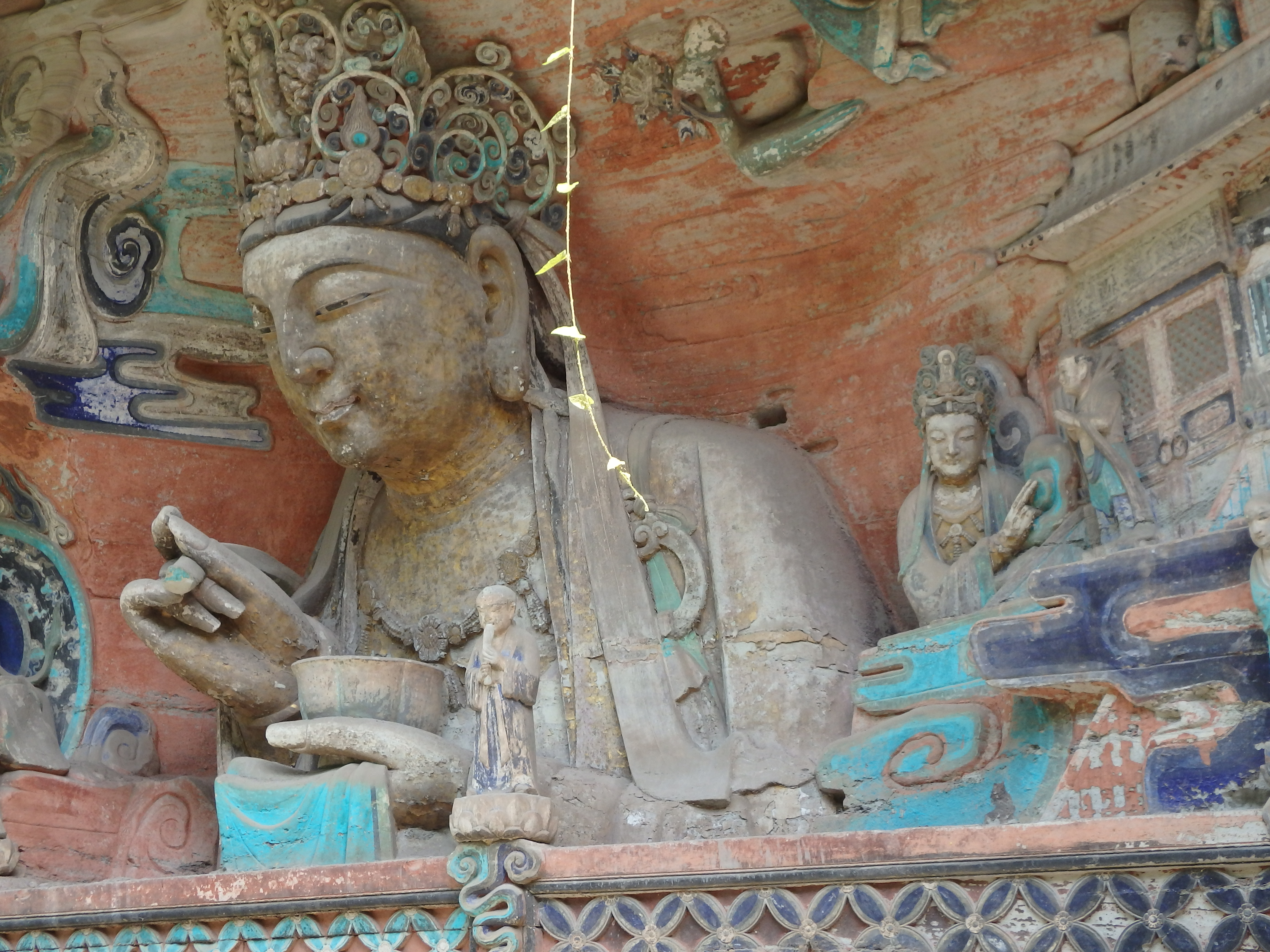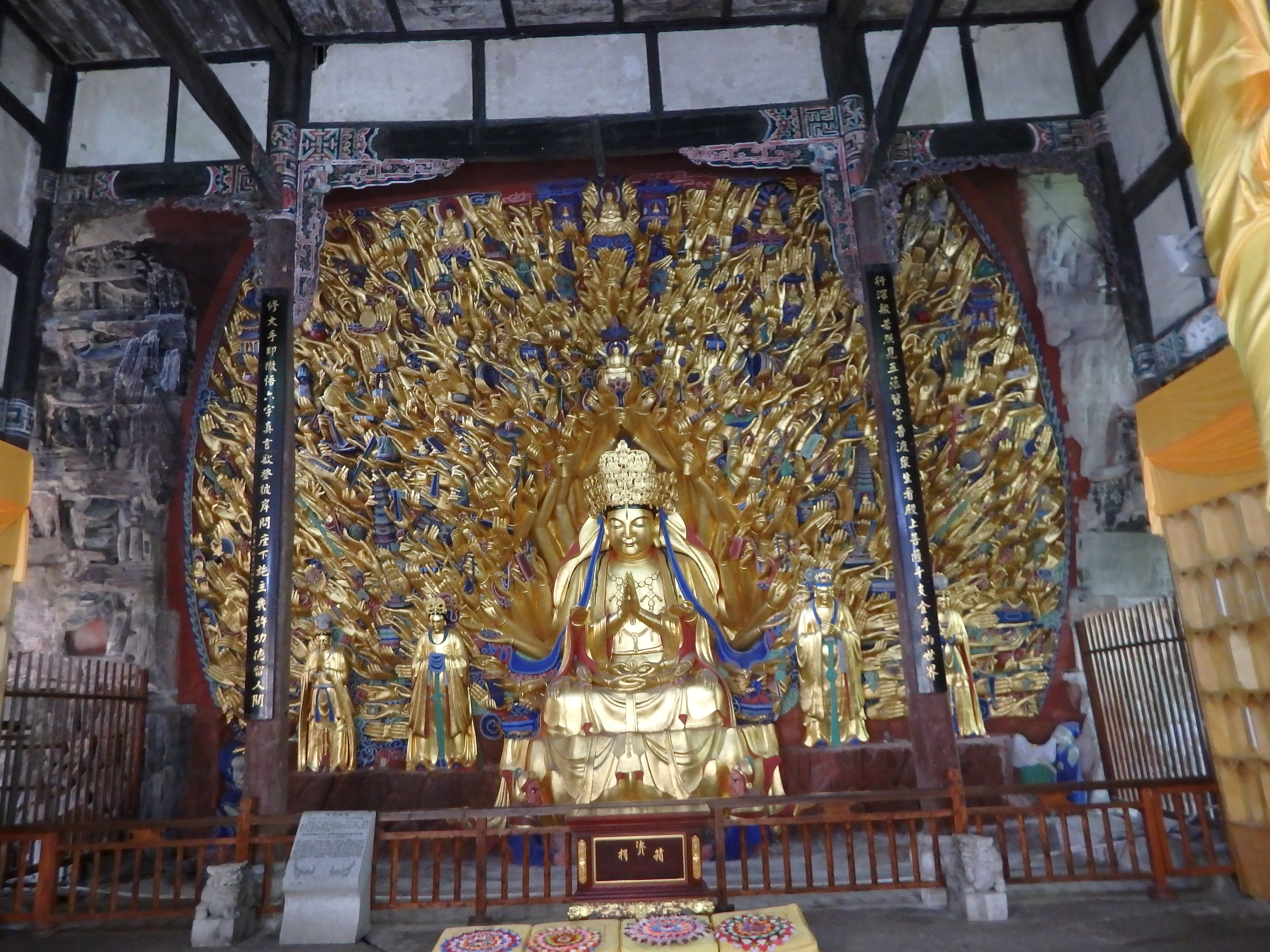 画像中上段:大足宝頂山千手観音像。ここの千手観音は本当に千手ありそうです。中心部が体で、周囲がすべて手です。中心部は宋時代、そのほかはかなり修復が入っています。 因みに日本で本当に千手ある千手観音は、寿宝寺、唐招提寺、大阪の葛井寺の3体のみで、一般の千手観音は、1腕を25手で数えます。