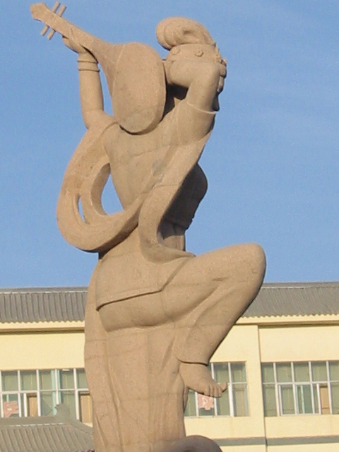 画像中上段:敦煌の町中にある反弾琵琶です。反弾琵琶は、図の通り背中に琵琶を抱えて引く技術ですが、本当にこの格好で琵琶を弾けるかは、私にはわかりません。敦煌の壁画中172窟がモデルになっているらしいです。因みに172窟は、普通窟で基本的にみられます。