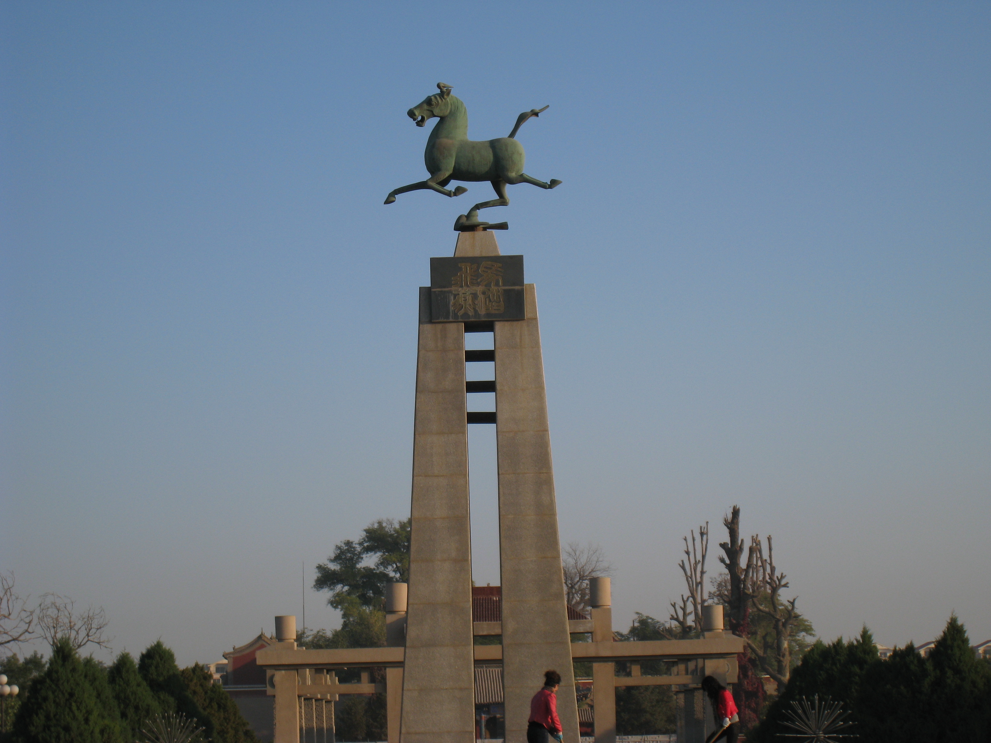 画像中下段:甘粛省武威において、1969年に出土した霊台漢墓出土の銅奔馬がモデルになっています。霊台漢墓は、現在、国家A4級に指定されています。馬の躍動感が表れて素晴らしい景色と思います。武威の象徴です。トップのイメージ画面のオリジナル写真です。