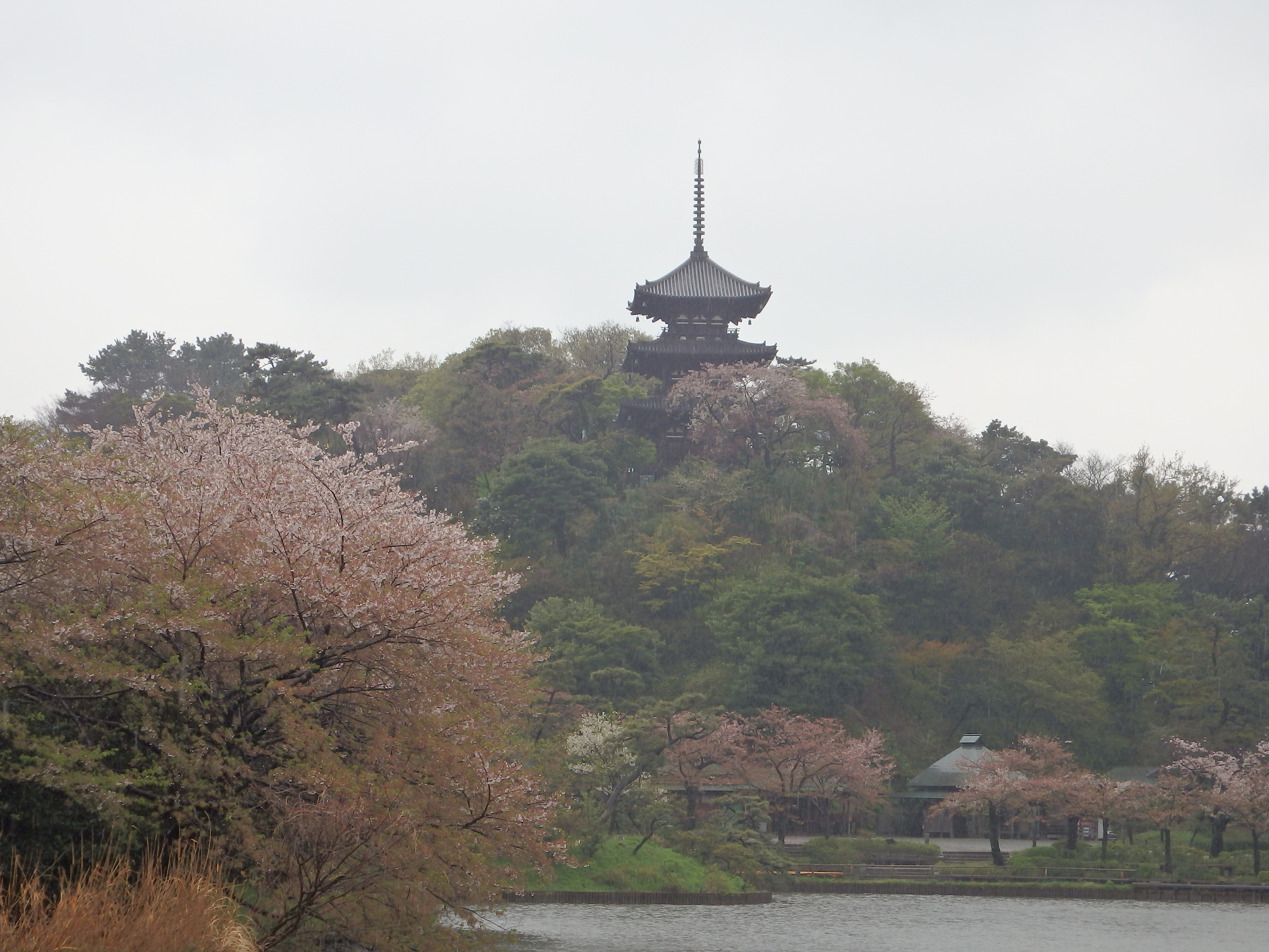 <画像の説明>三渓園旧燈明寺三重塔(手前大池)