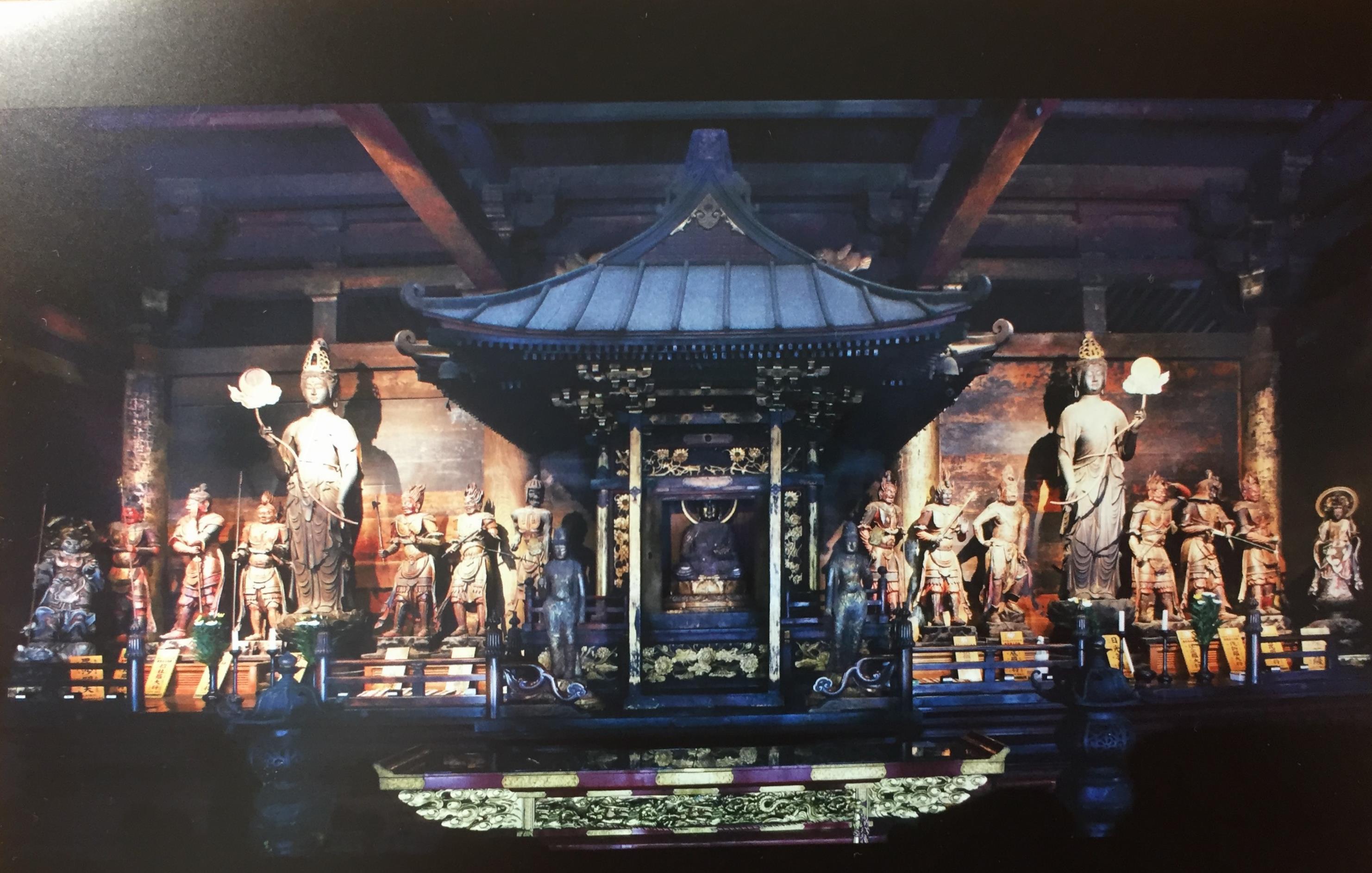 厨子内の薬師三尊像は秘仏です。両側の日光・月光像と十二神将は拝観可能です。