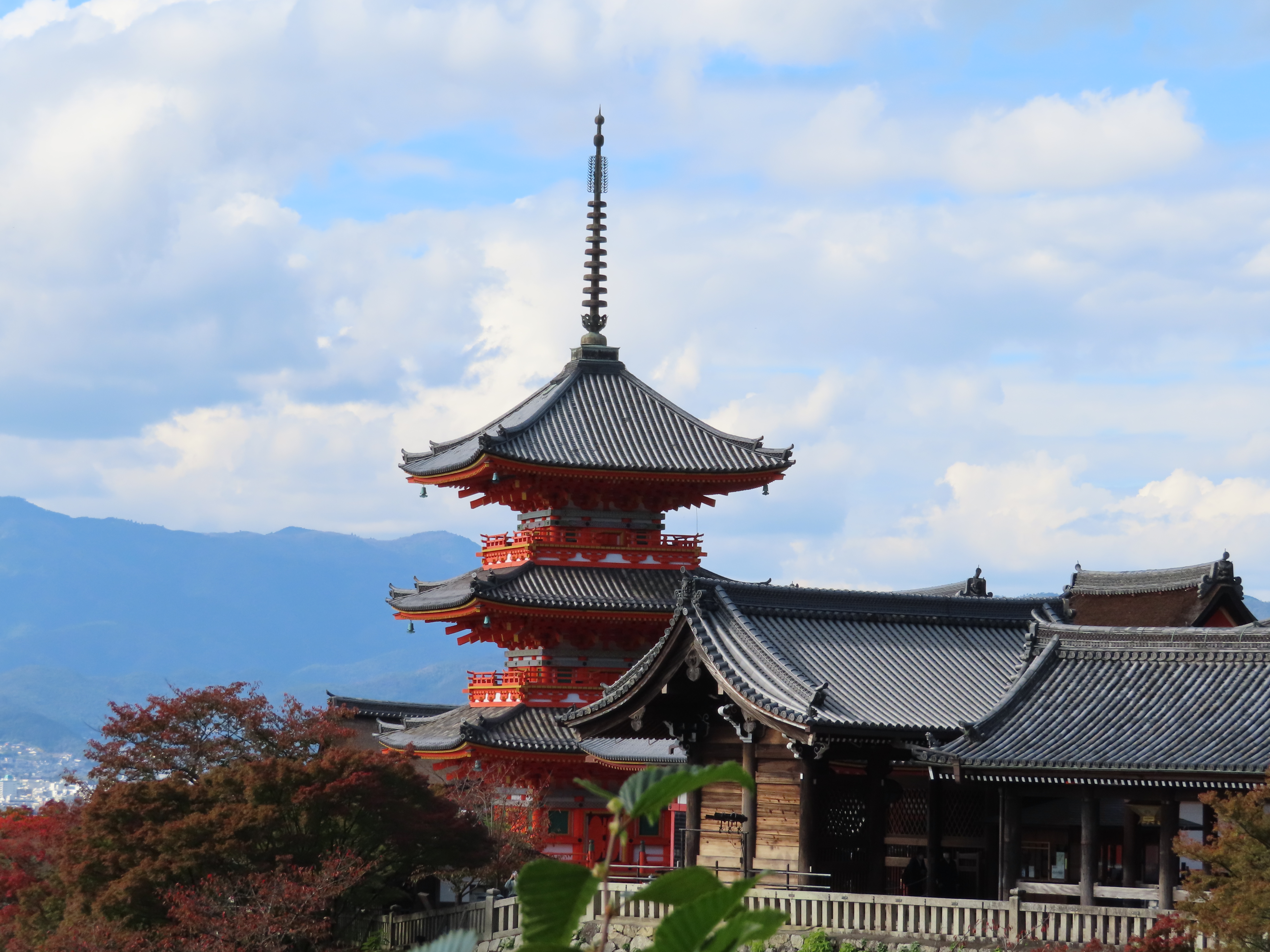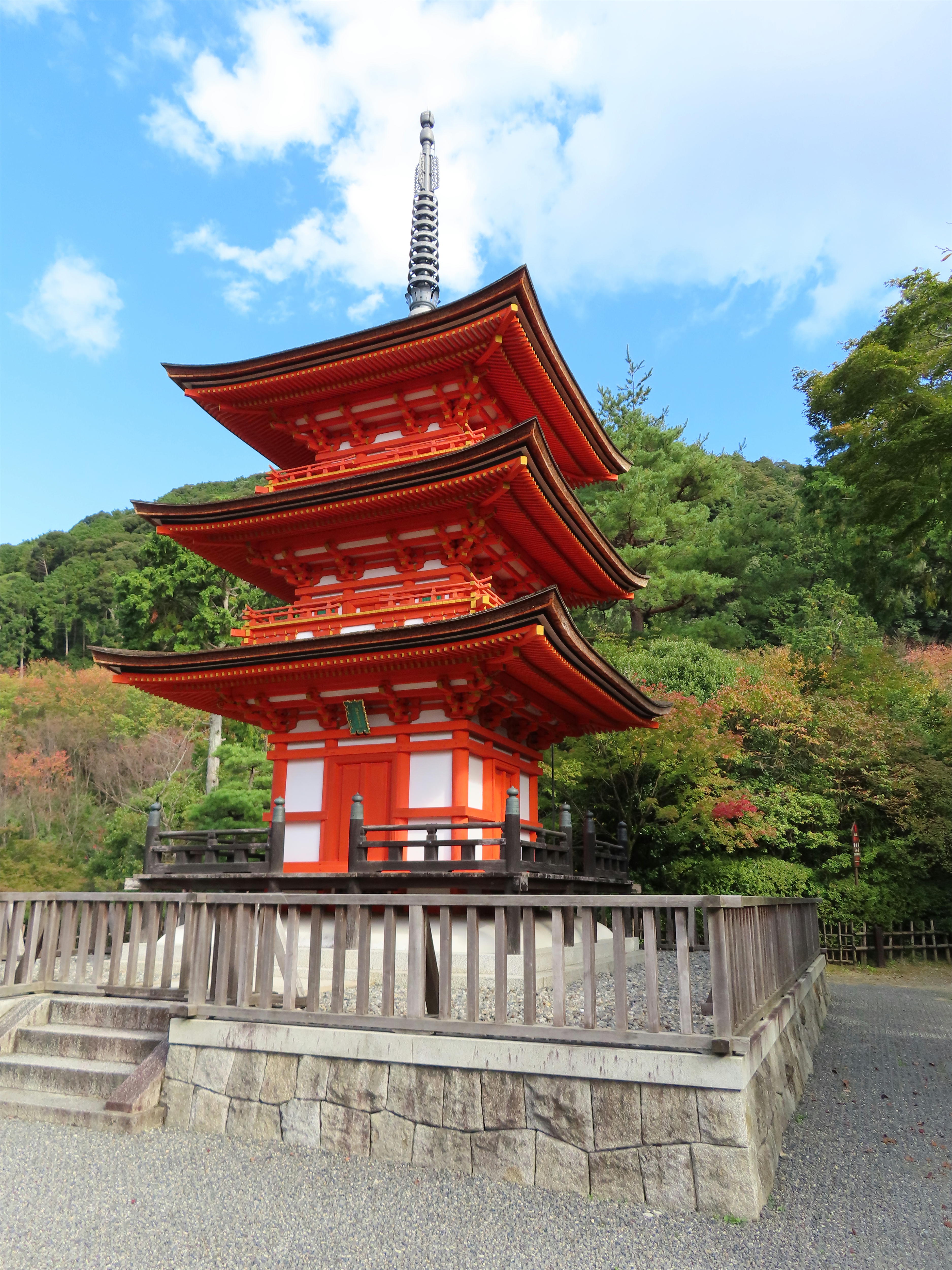 あまり知られていないのですが、子安の塔(三重塔)のある泰山寺からみた清水寺本堂一帯は絶景です。子安の塔は、葛井(ふじい)親王に由来するとされます。葛井親王は、桓武天皇の第12皇子で、坂上田村麻呂を外祖父に持ちます。本堂横の三重塔同様観音菩薩の安産、子育て信仰を担っています。