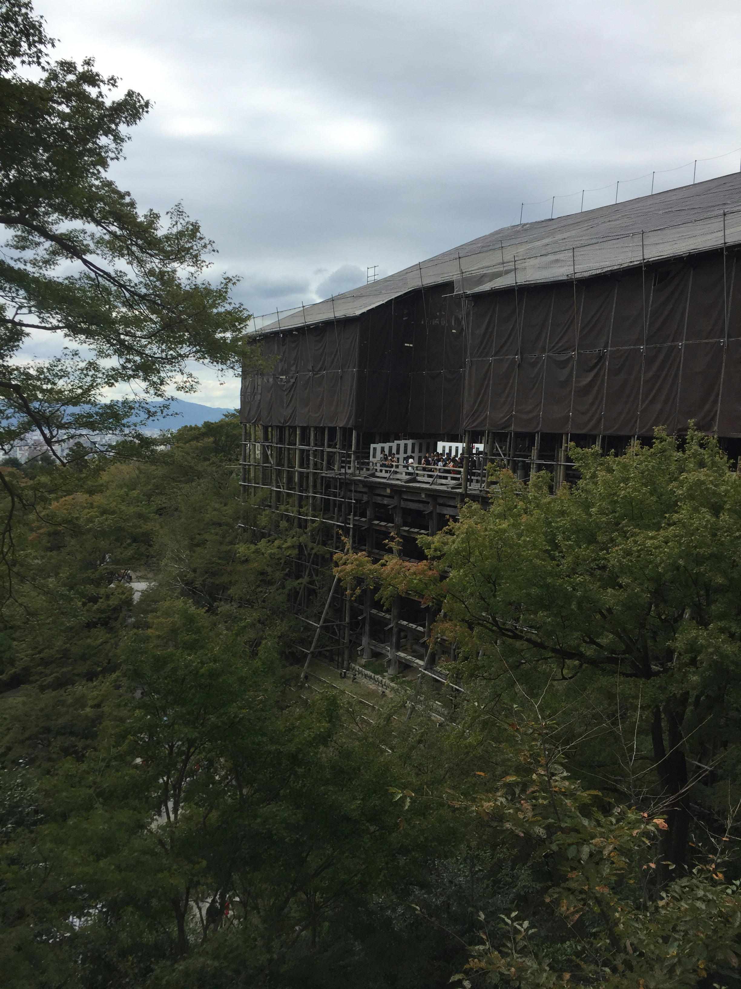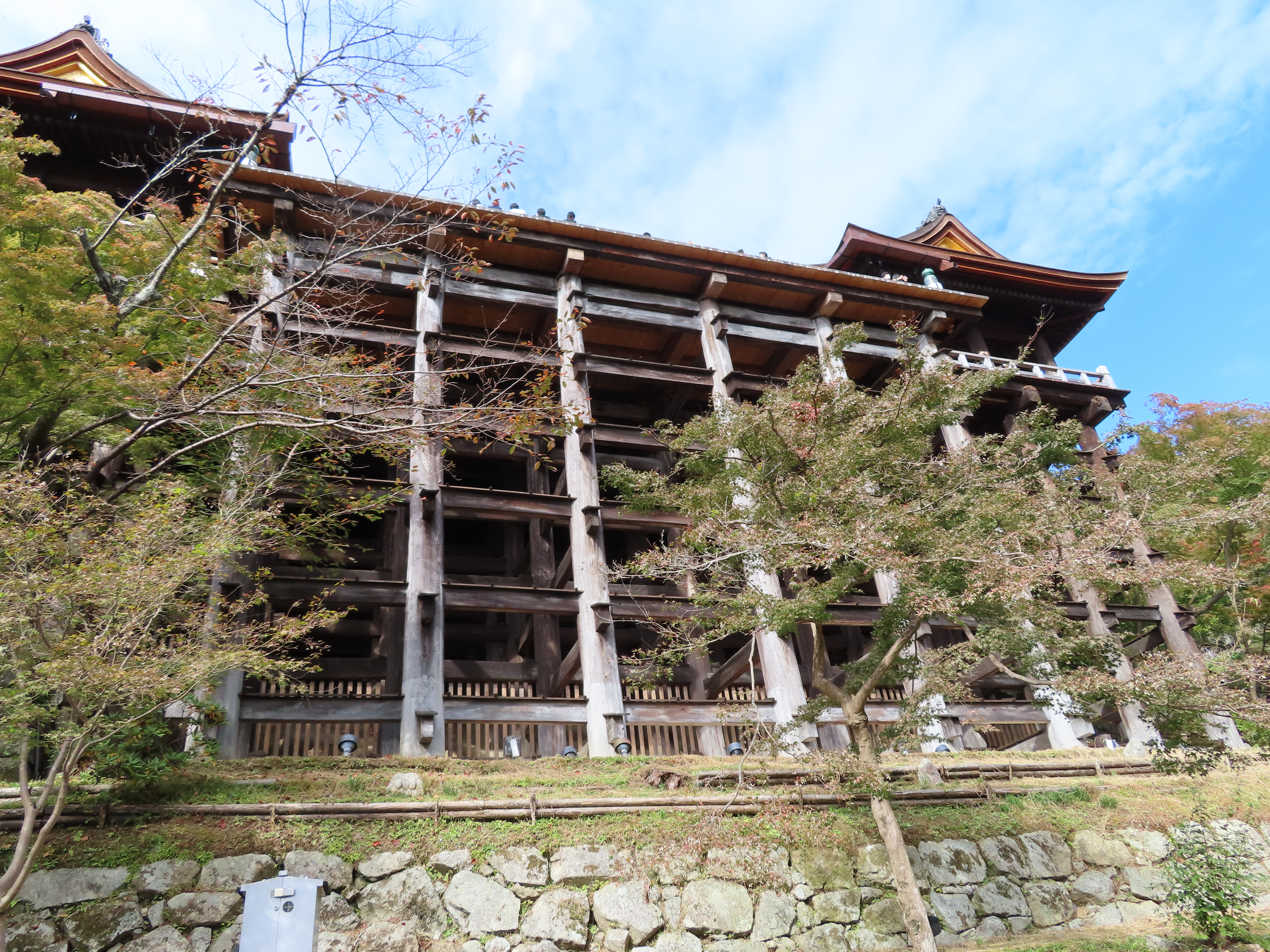 清水寺の本堂の様に、崖や池などの上に長い柱と貫で建物を固定し、上部に広い平面を確保する建物の建て方を、懸造り或いは舞台造と呼びます。清水寺の場合は、釘を使わず楔(くさび)によって固定されています。舞台の下は18本の柱が6本3列に配置されています。(写真では真ん中の6本です。)今回の改修によって、舞台を支える柱は、基本新しいですが、旧来の柱もできる限り使われていることがわかります。