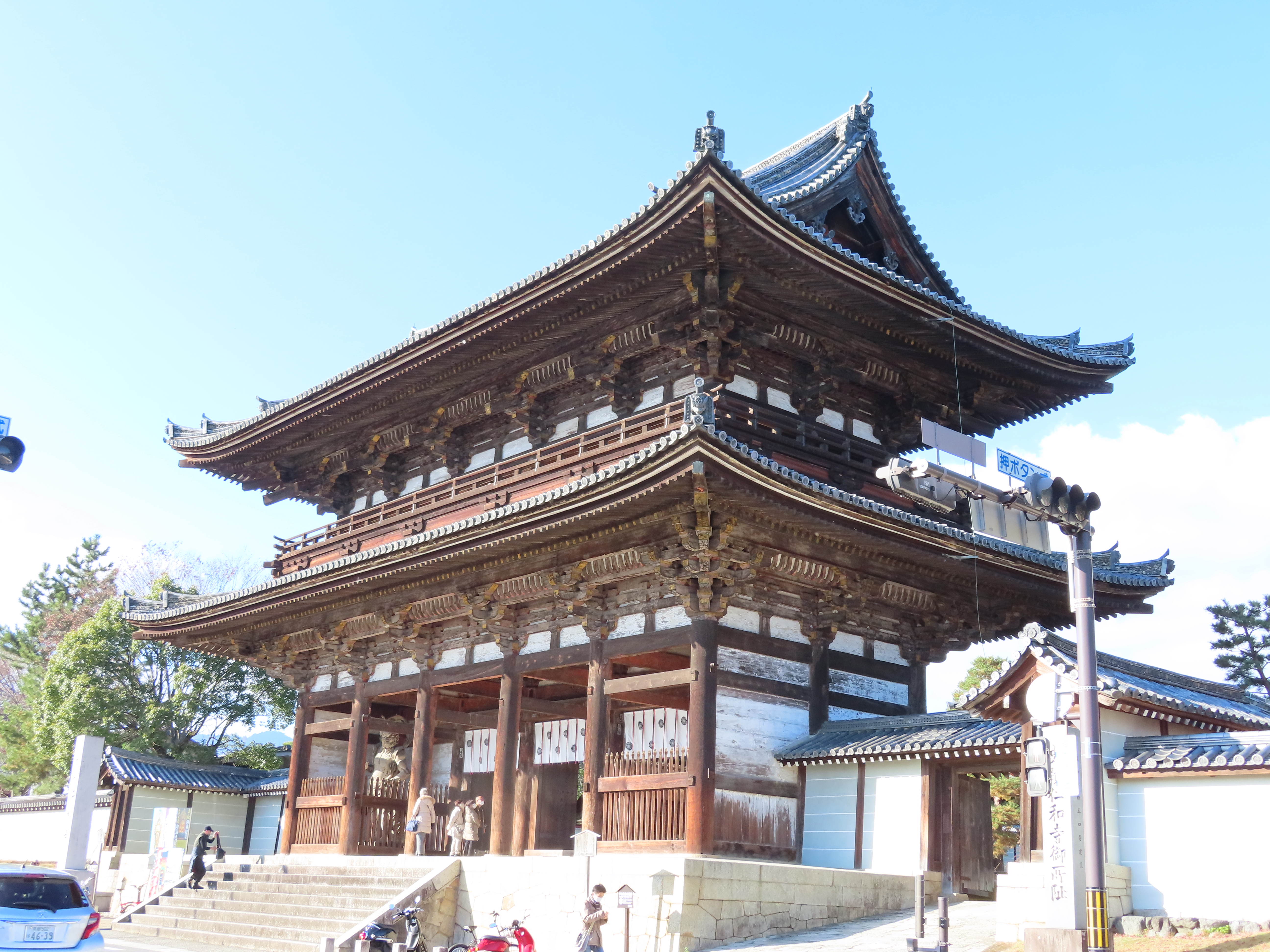 御殿内部よりみる五重塔は秀逸です。当寺の五重塔も金堂と同様寛永年間の建立、重要文化財です。工法は純和様で、総高は約36mです。江戸時代の他の塔同様逓減率は小さいのですが、バランスの取れた重厚なつくりとなっています。二王門も重要文化財です。正面に阿吽の仁王像を安置します。工法は純和様、平城京の朱雀門を彷彿とさせます。