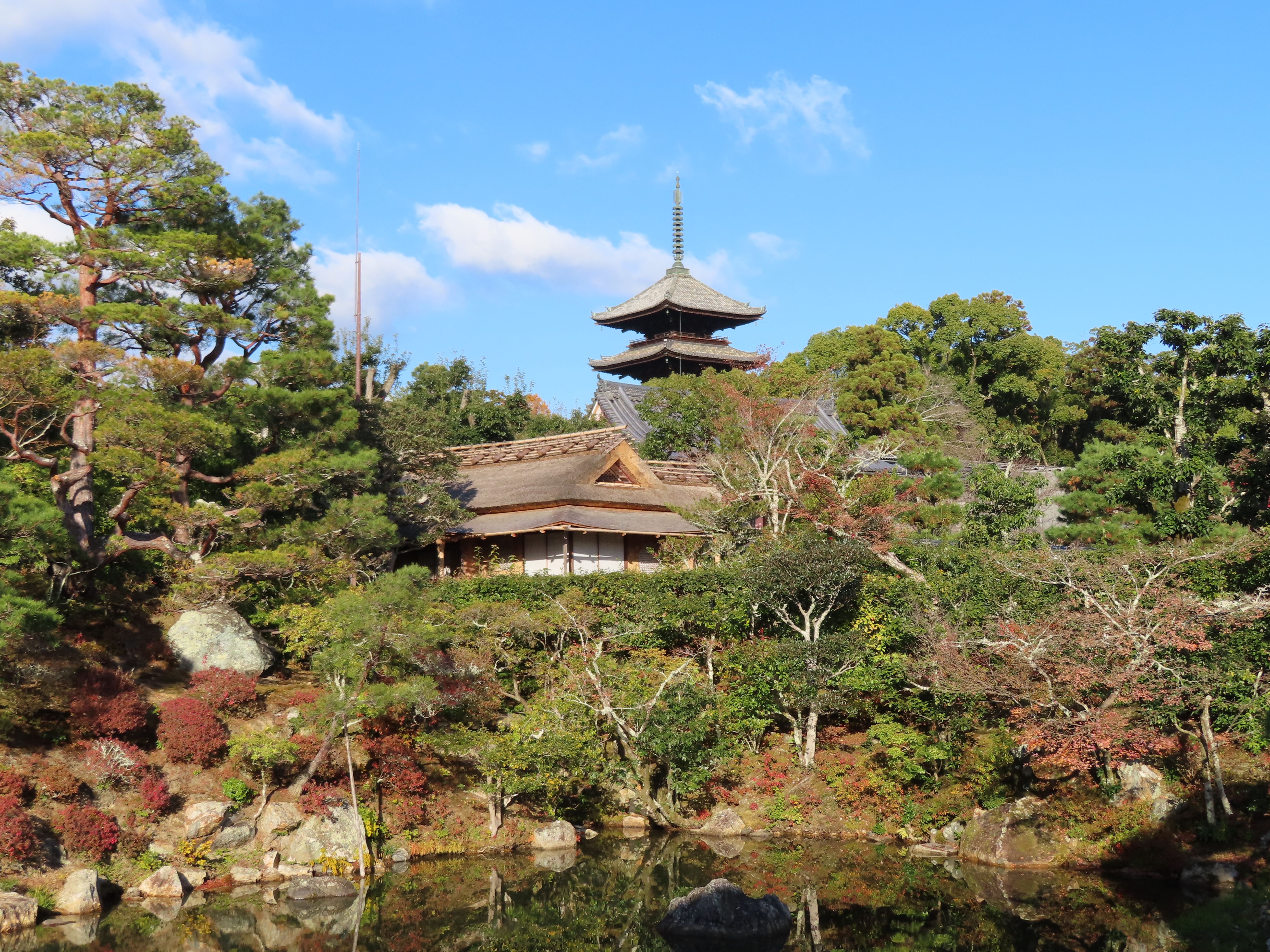 御室は、仁和寺を建立した宇多天皇のために設けられた室(僧侶の住居)の事でしたが、鎌倉時代以降仁和寺そのもの或いはその近辺を表す地名となっていきました。当寺は、応仁の乱で荒廃しましたが、徳川幕府の援助により、寛永年間に復興に着手しました。金堂は、この際、内裏の旧紫宸殿が移築改修され、仏堂風に改めたもので、国宝です。屋根が両翼にきれいにひろがり、優美な姿を醸し出します。