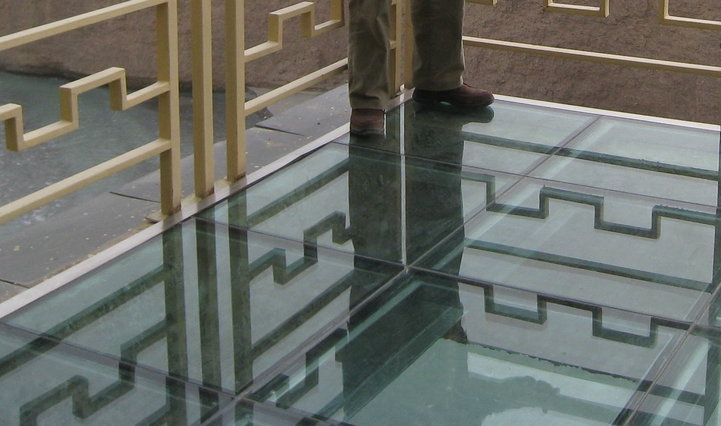 討頼河には、展望台が突き出ていますが、床がガラスで、高所恐怖症の人では、足が出せないと思います。中国の信頼性の基準では?と思いながら、折角の記念なので、最先端まで行って写真を撮ってもらいました。