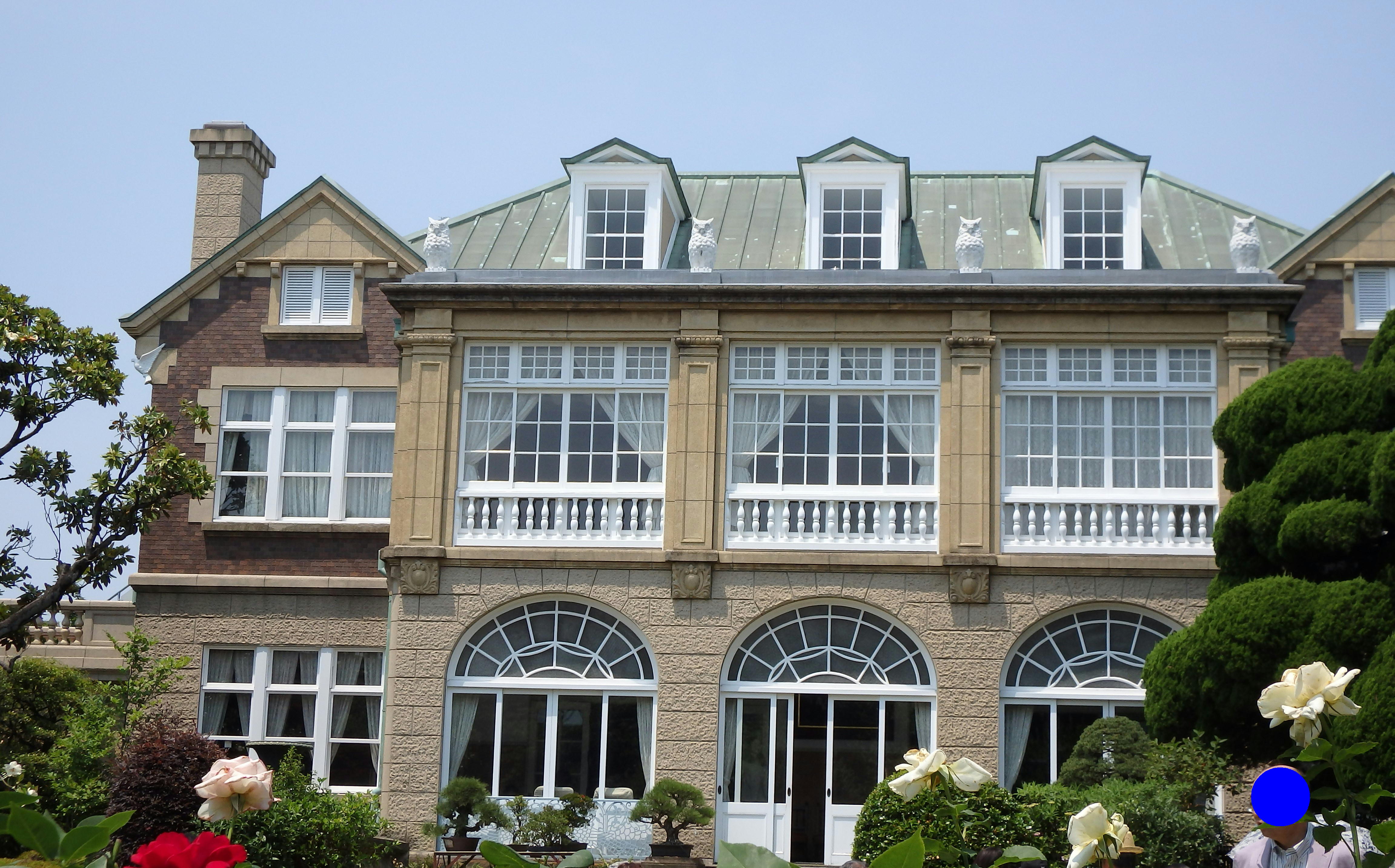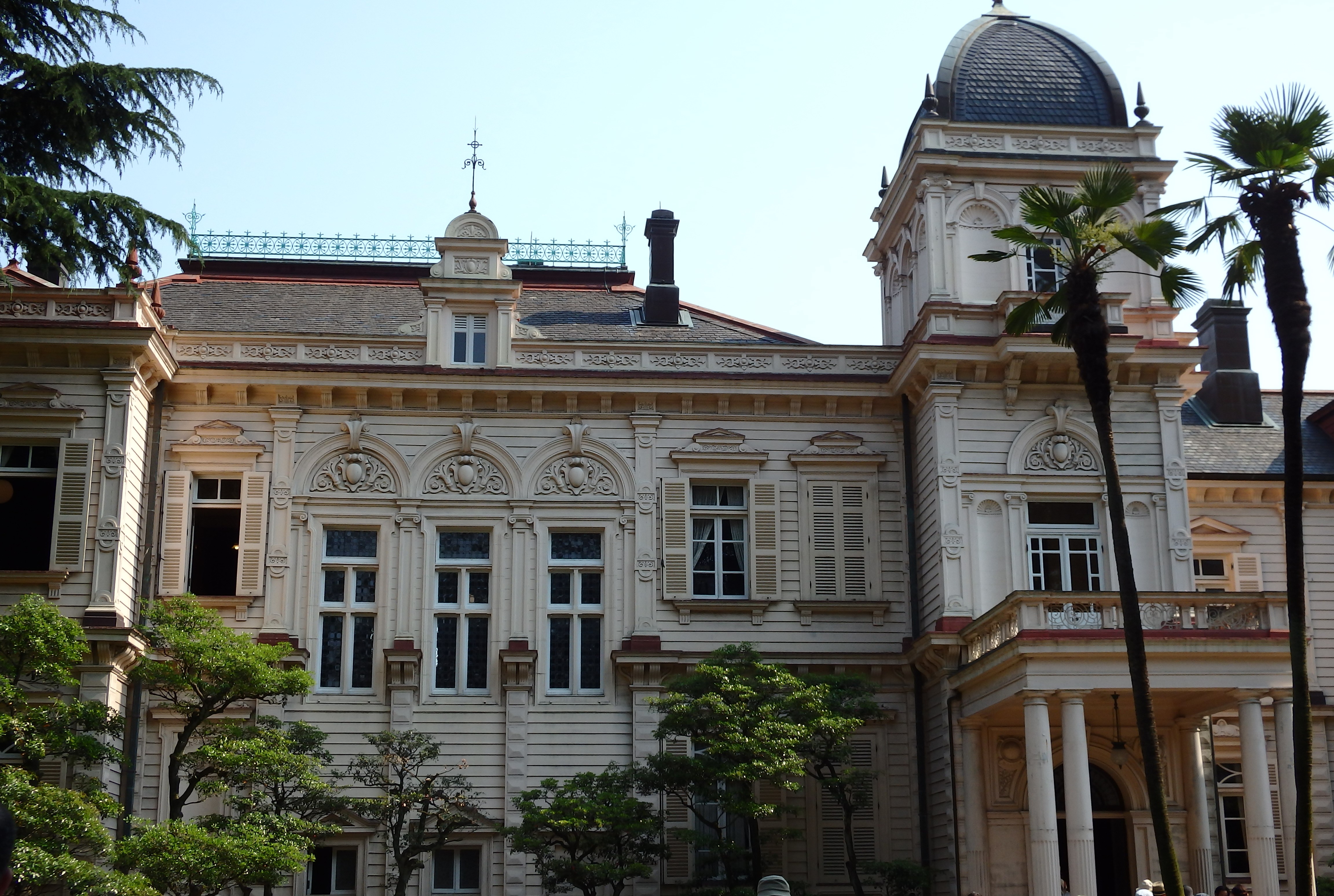 2つ目は旧岩崎邸です。旧岩崎邸は、岩崎弥太郎の子供岩崎久弥(三菱グループ第3代総帥(*))の自宅でした。青いドームが印象的です。石造りのように見えますが、実は木造建築です。1896年(明治29年)ジョサイア・コンドルによって建築されました。明治時代の作品です。