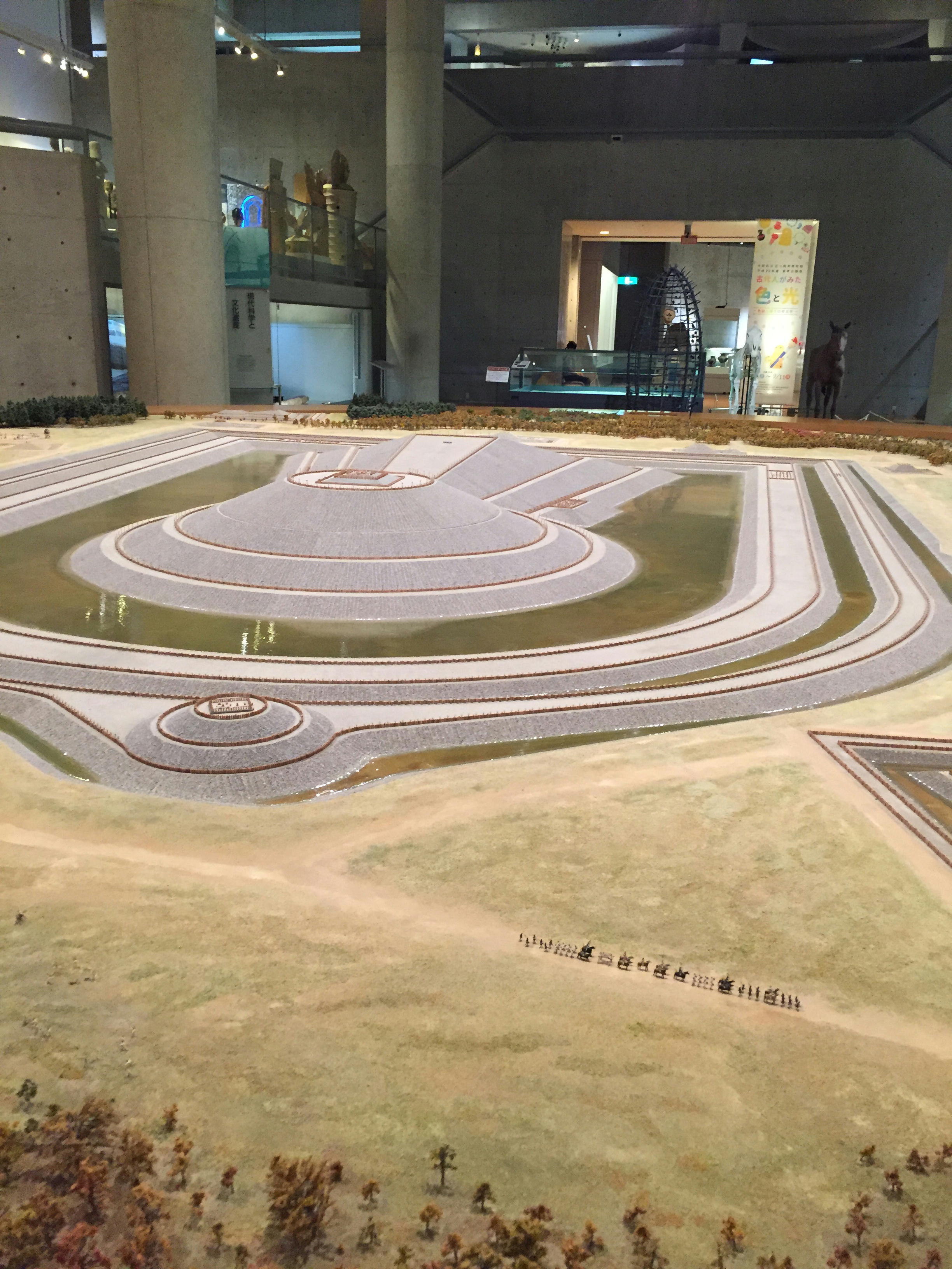 箸墓とは時間的なギャップはありますが、構造上の基本的な差はないようです。このジオラマにより、埴輪(箸墓は土器の一種)で断面を区切りながら、高く上に伸ばしていく工法が読み取れると思います。箸墓以降、全国各地の多くの前方後円墳は、墳丘の設計図を共有しており、数十年程度の比較的短い時間で北九州から東北南部に広がったと考えられる点から、統一後の初期大和朝廷のシンボル的存在とも考えられています。前方後円墳は、もっとも日本的なものの一つに挙げるべきでしょう。
