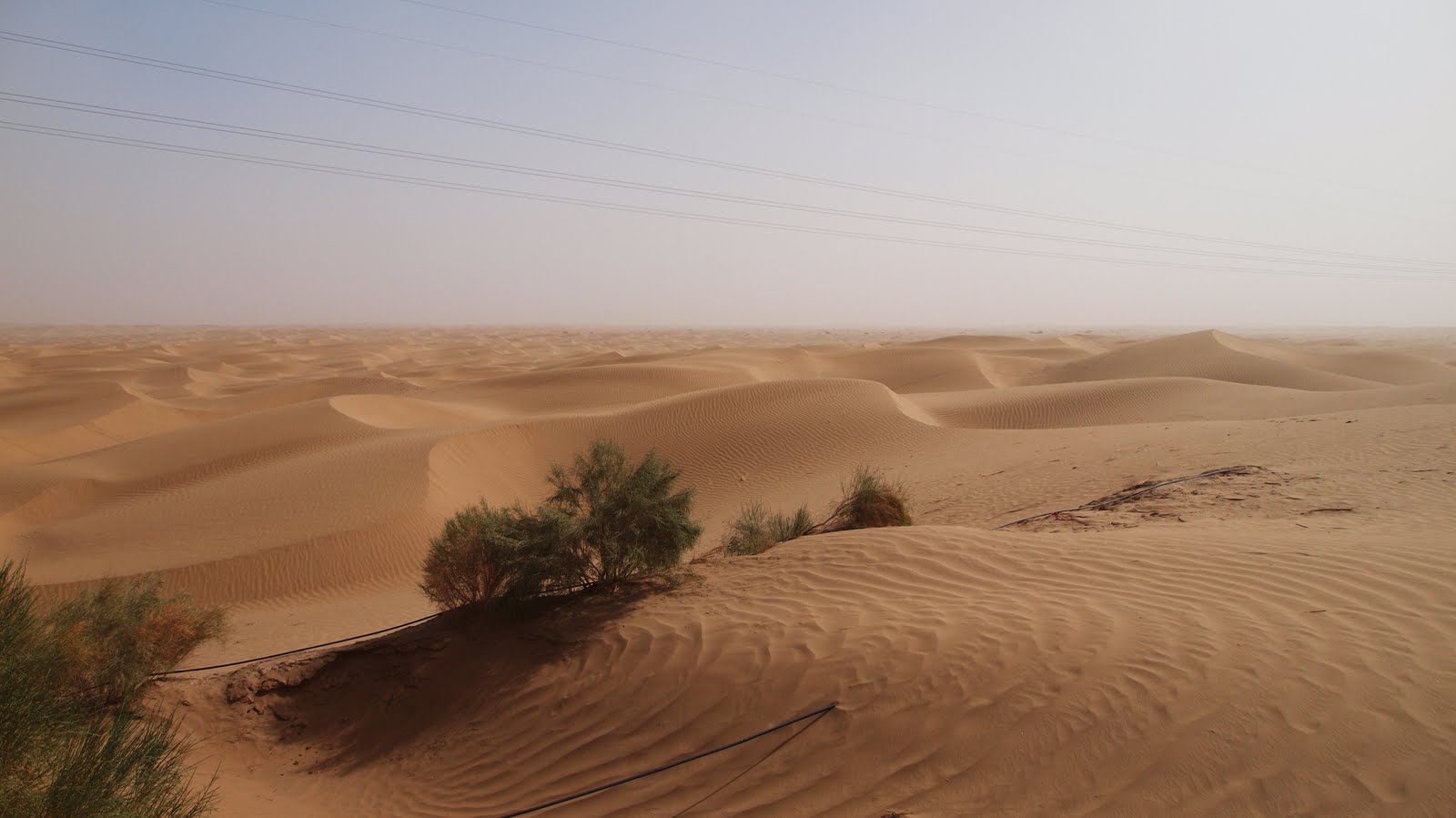 (画像の説明)タリム砂漠 広大な砂漠に延々と送電線が走る