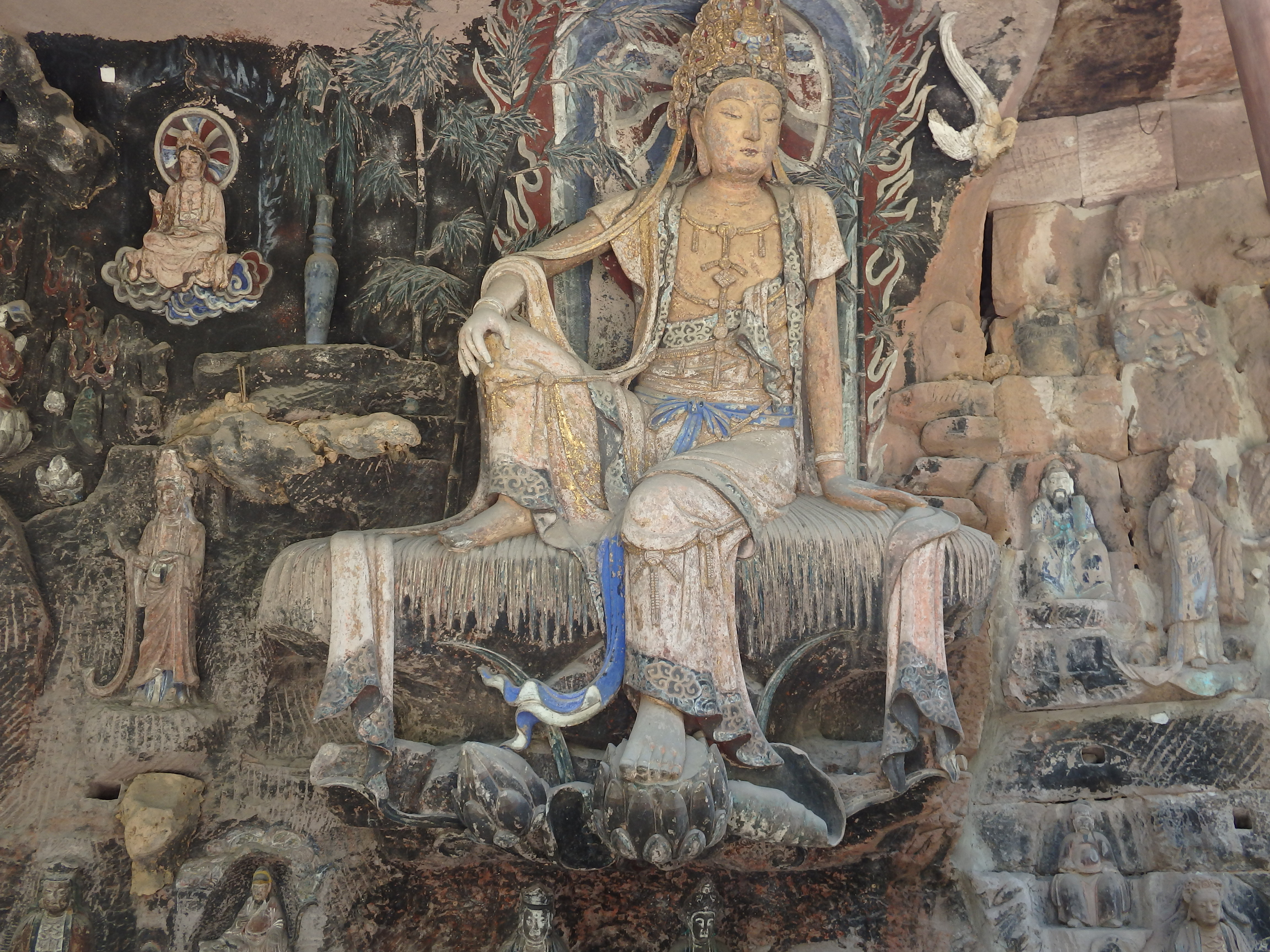 東慶寺の水月観音坐像と最近中国でブレイクしている安岳毘卢洞(*)に残る石造の水月観音坐像を比べてみてください。ほぼ同時代の作品です。