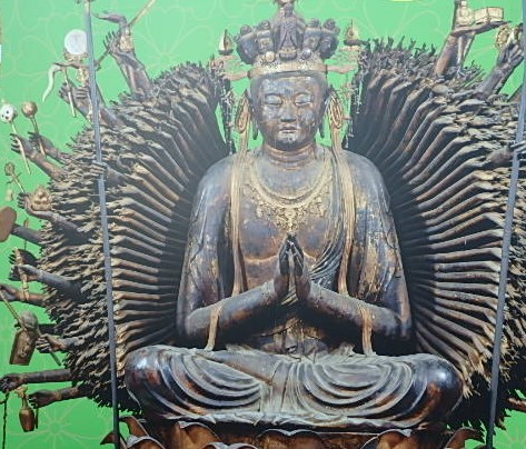 (*2)寿宝寺(京都)重要文化財。平安時代 一木造り。身体の正面に合掌の手2本、定印の手2本、錫杖を持つ手2本、計6本の手があり、更に身体の周りを円状に囲むように持物を持つ大手が20本、その他小手を合わせて、1000本あるとされます。