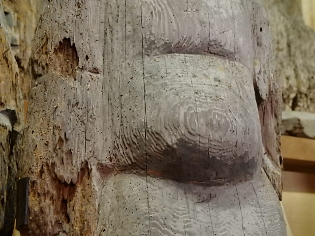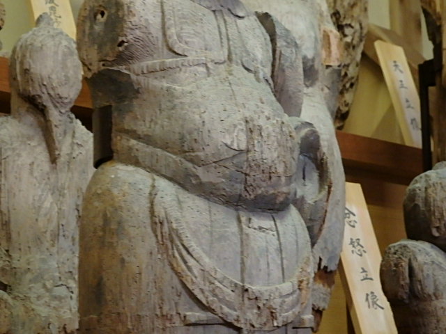 ほかにも、達身寺には、特徴がいくつかありますが、最後に達身寺に多い一木造について、簡単に述べさせて戴きたいと思います。達身寺の仏像は、基本が一木造です。それは、残る仏像の殆どに縦しまの割れ目が現れていることからも明らかです。このことは、定朝以来、この現象を嫌いその対策として中刳りを徹底するため寄木造を発明し、また一木造であっても割矧ぎを発明してそれを良しとし実践した鎌倉時代以降仏師の中心となった慶派の仏師とは、一線を画するものであり、この地方独自の仏師の存在の可能性を彷彿させます。