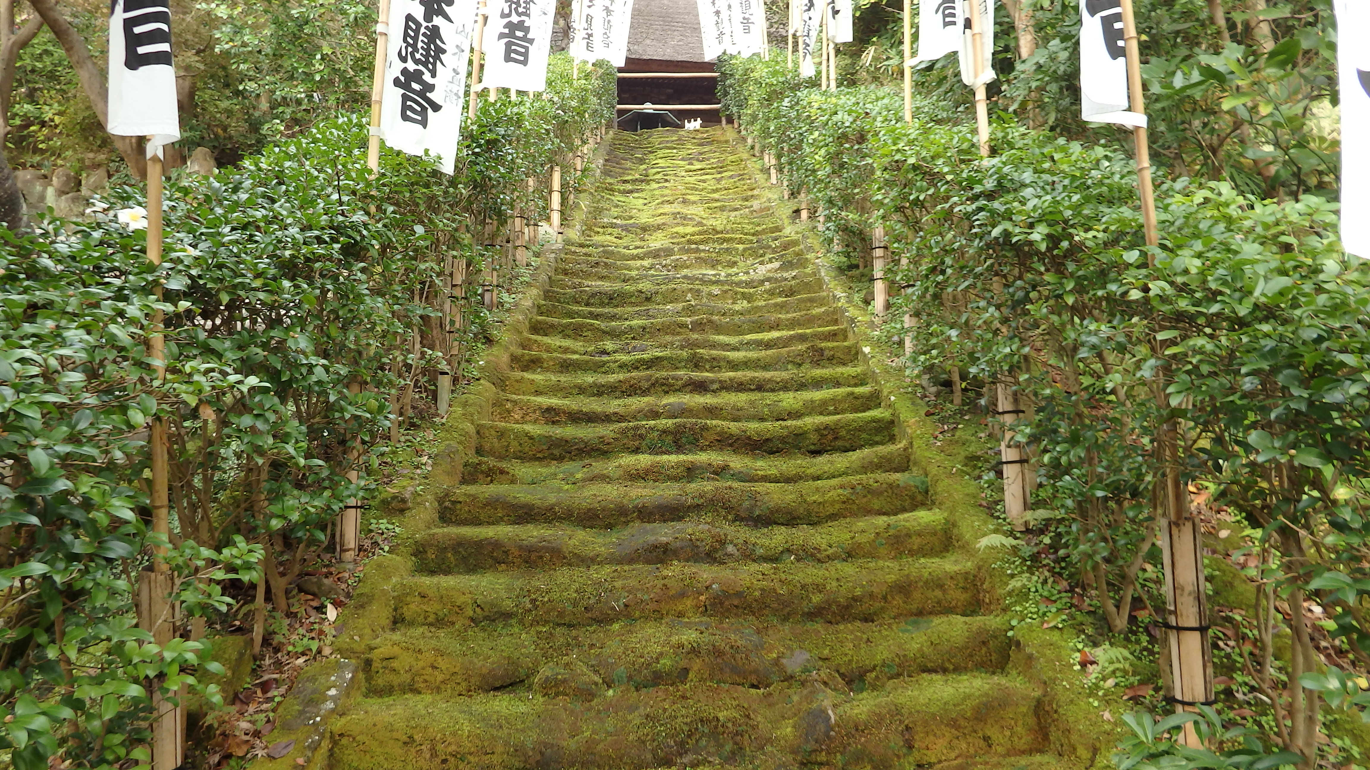 (*1)杉本寺は、鎌倉幕府成立前から、当地にあった鎌倉で最も古い寺院の一つと言われます。本堂内には、重要文化財の十一面観音立像が安置されています。お寺の行事の際には、厨子が開くそうですが、普段は扉も締まり、お参りさせて戴けません。苔むした石段が印象に残ります。