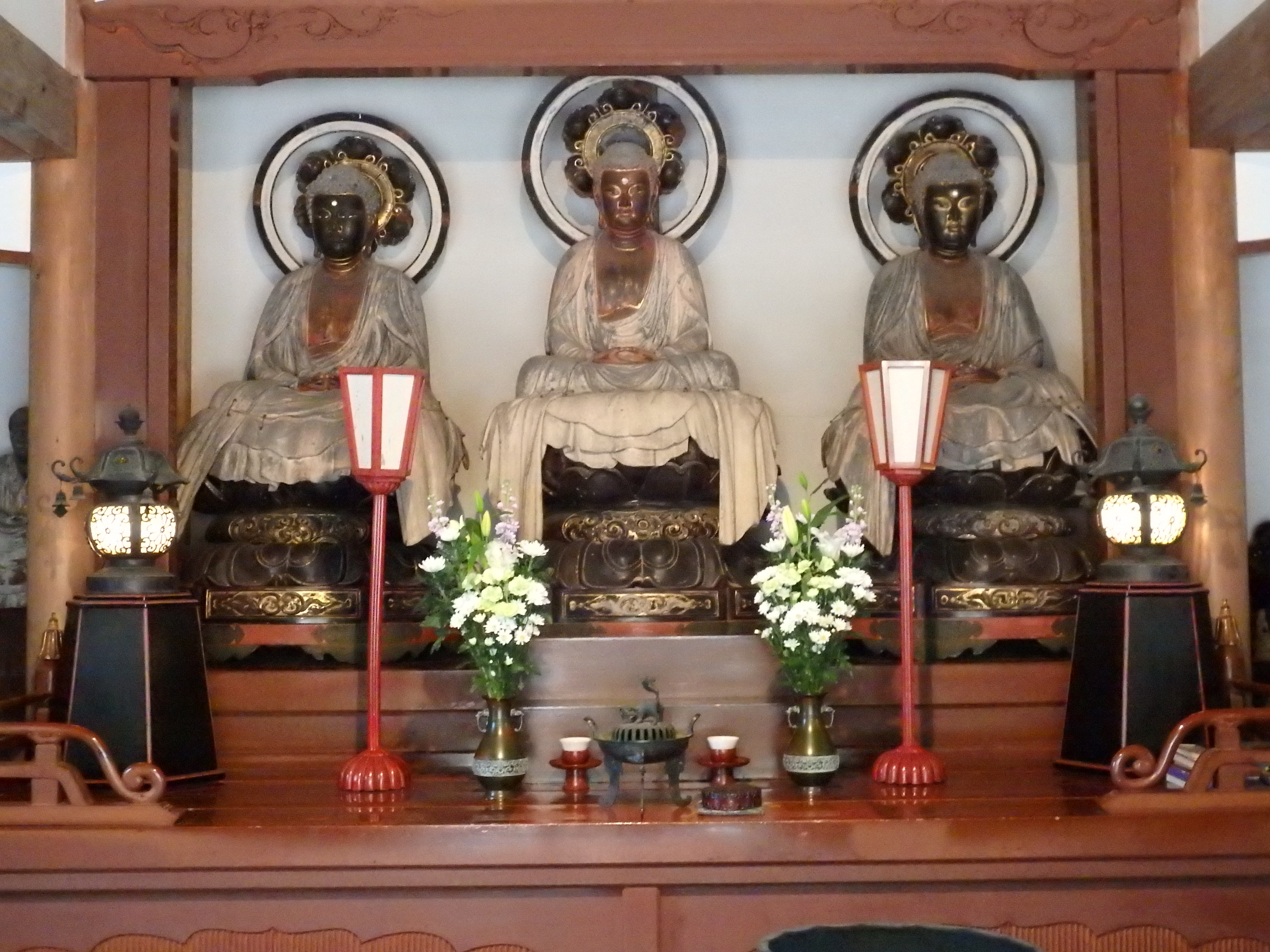 (*3)三世仏(さんぜぶつ)とは、過去・現在・未来における教化仏のことです。法隆寺金堂のように、一般的には薬師如来・釈迦如来・阿弥陀如来の三如来があてられます。また、京都泉涌寺や当寺のように、阿弥陀・釈迦・弥勒菩薩(如来)があてられる場合もあります。