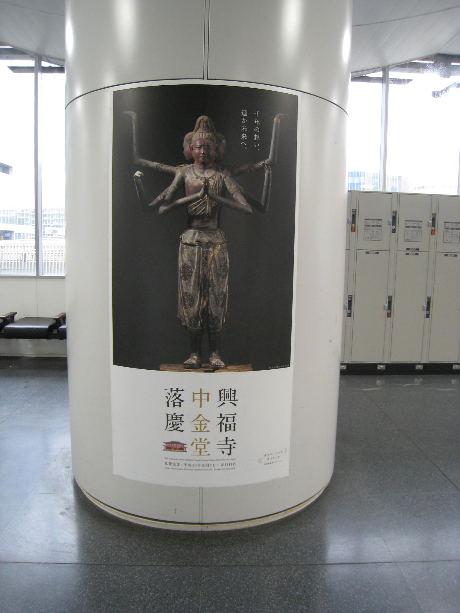 ところで、中金堂のすぐ隣に国宝館があります。阿修羅の人気は相変わらず絶大です。私が中金堂へ行った際も、国宝館開門前の時間でしたが、既に観光バスが何台も止まっており、多くの人が待たれていました。実は中金堂にも阿修羅のファンがおられました。中金堂に阿修羅が祀られていると勘違いされたらしいのですが、このポスターが原因らしいです。どうでしょうか。中金堂の落慶法要のポスターですが、阿修羅が中金堂に祀られていると思ってしまう人いるのではないでしょうか。