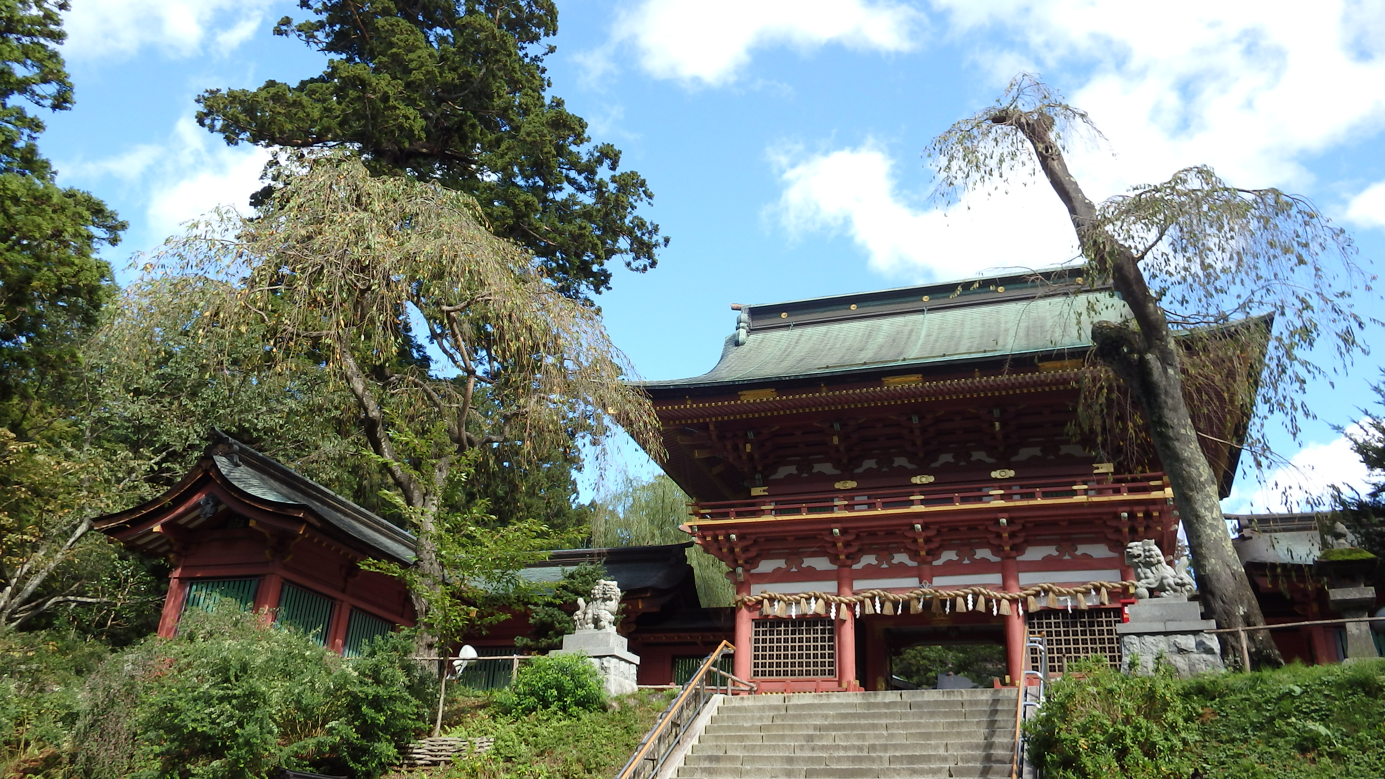 境内の社殿14棟と鳥居1基がすべて国の重要文化財に指定されています。社殿は、伊達氏によって建立、江戸時代前期、元禄から宝永年間に順次完成しています。鳥居をくぐると石段の先に朱塗りの随身門(*2)が見えます。3間入母屋造り、銅板葺きです。随身門の先に唐門があります。唐門とはいうものの、屋根は唐破風にはなっていません。なぜ唐門というのか、良くわかりません。