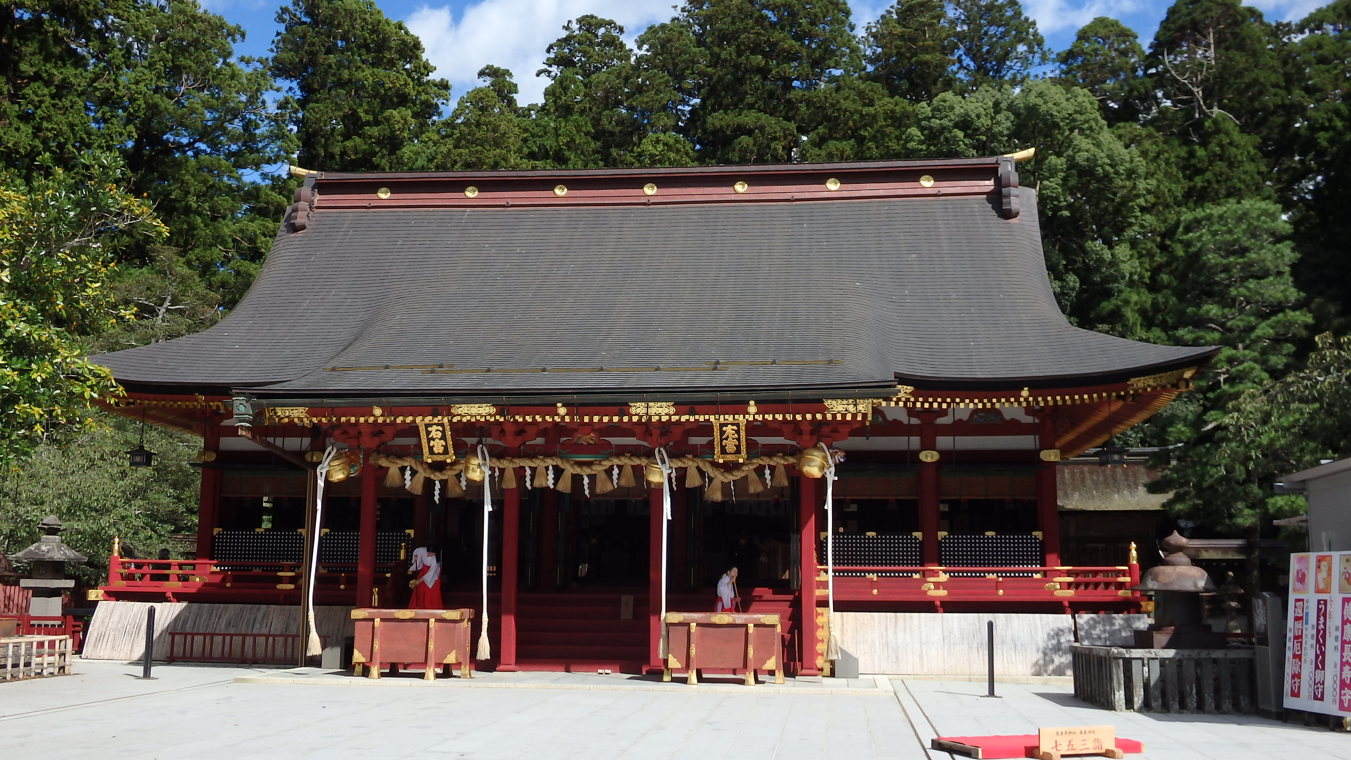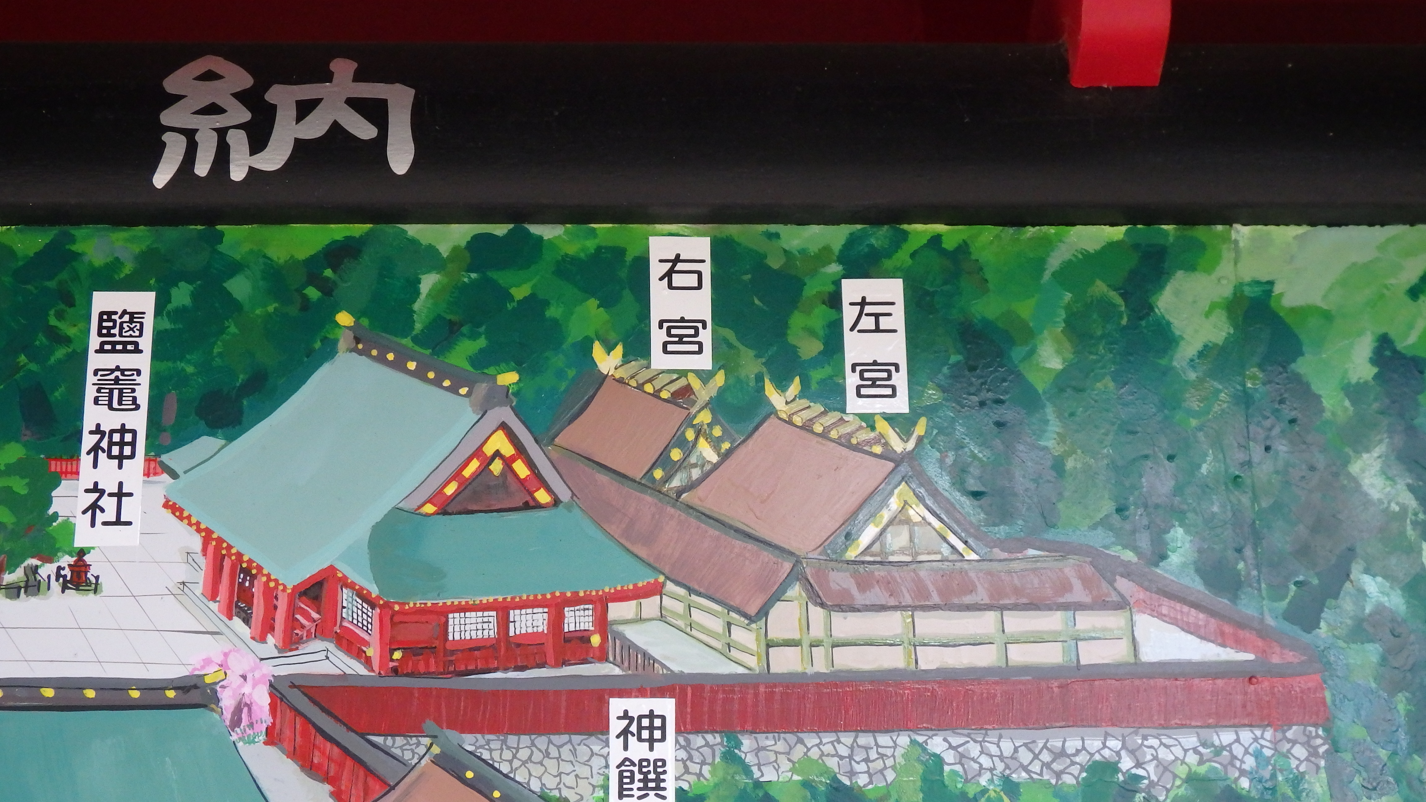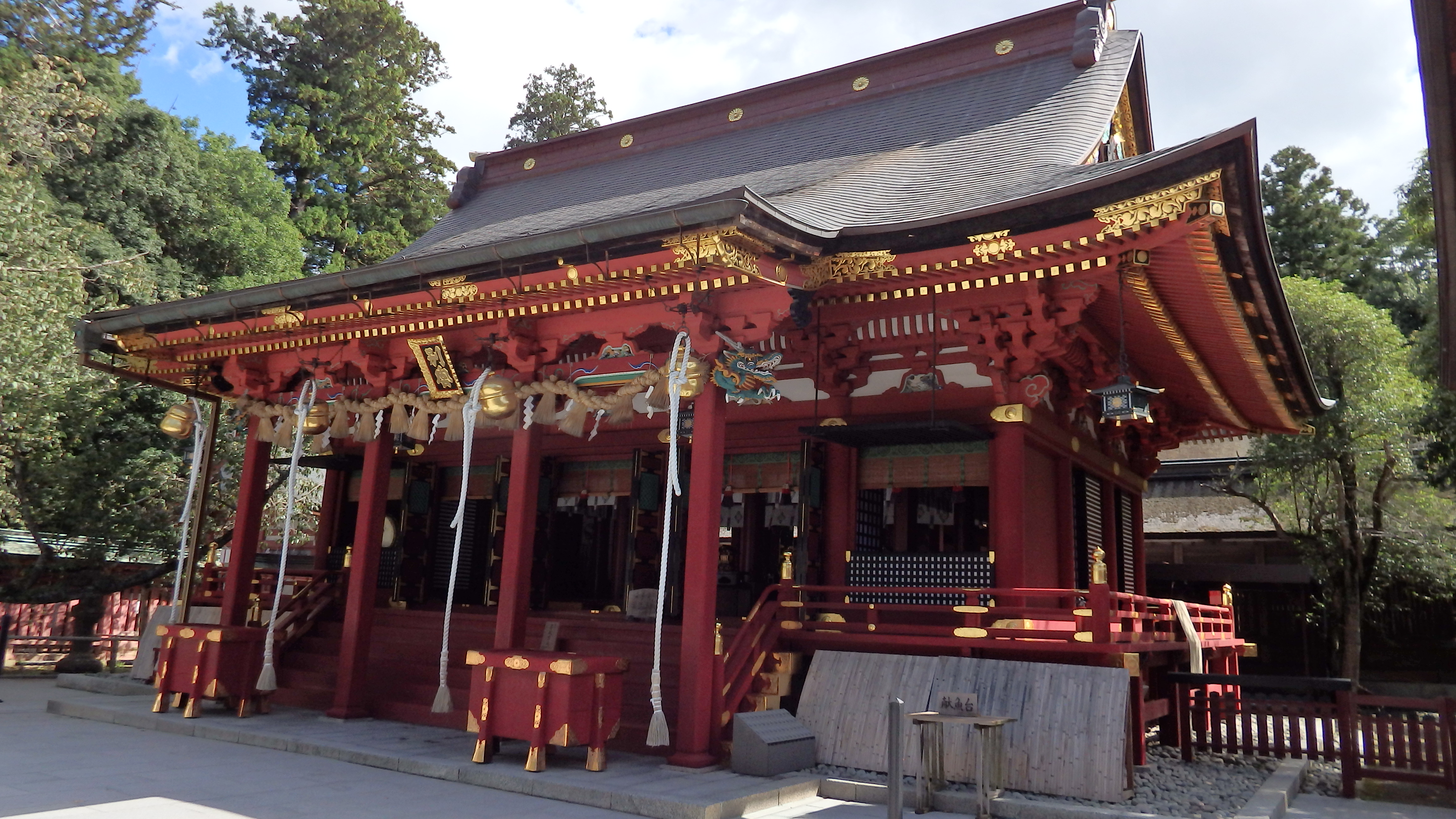 唐門の先に、正面に社殿があります。左宮:武甕槌神右宮:経津主神を祀ります。建物は、桁行(梁に対して直角方向)7間、梁間(梁に対して平行方向)4間、入母屋造り、銅板葺きです。本殿に向かって右側3間が左宮、向かって左側が右宮(左右は私たち参拝者ではなく、神様から参拝者を見た向きです)。本殿背面には左宮本殿・右宮本殿があります。これらの関係は、言葉では説明がややこしいのですが、域内の説明パネルを撮影させて戴きましたので、これをご覧になれば、お分かりいただけると思います。